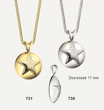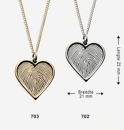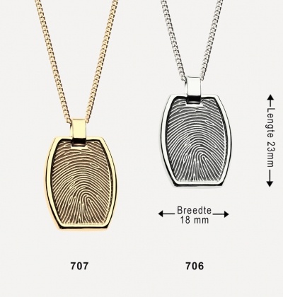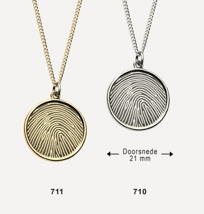 Sieraad op aanvraag te voorzien van gravure van vingerafdruk, tekst, pootafdruk, familiewapen, handtekening, symbool of dergelijke aan zowel voor- als achterzijde